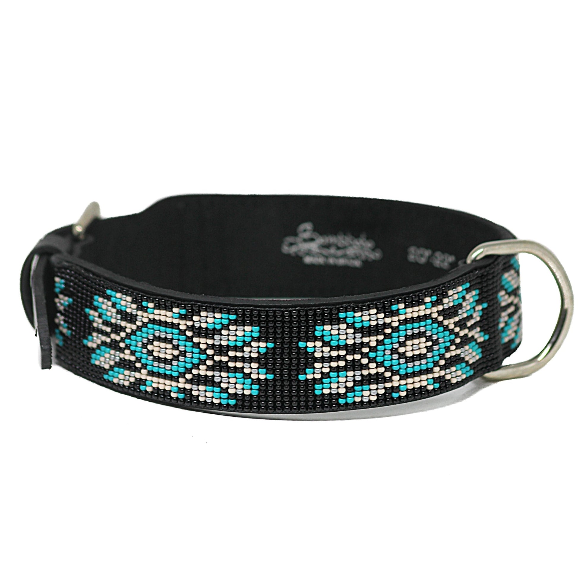 Bora Bora beaded dog collar with black leather. Black, turquoise and white beads. Comes with the round shape leather tag.