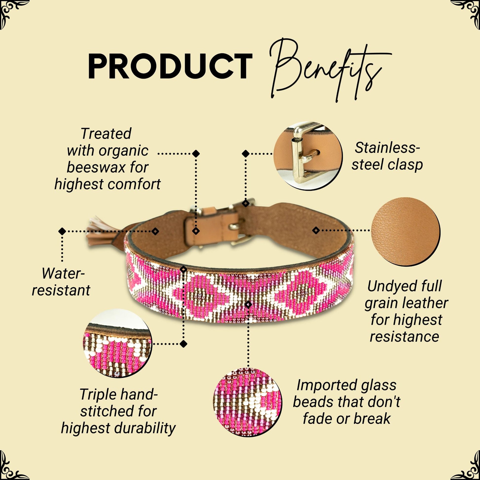 Our dog collars are luxury master pieces, completely unique and handmade by artisan women in Brazil. The vibrant colors, sun reflecting beads and unique design will make your little baby shine. Our pieces use full grain leather which is the highest rating for leather quality. Because full grain leather has the full, complete grain of the hide, it is the most durable leather and is solely used by luxury brands. This feature makes this collar very flexible and comfortable for your fur baby. Our leather is treated with organic beeswax which makes it suitable for outdoor activities such as hiking and the beach. Please note that our leather is purposely un-dyed and very pliable to provide your little pup with the highest comfort. Each bead is made of unbreakable glass and stitched one by one following the ancient Brazilian tradition of “tear beading” to make the stitching indestructible. This stitching method allows for resistance to scratching so you can be assured that the beads will not fall off. The strong buckles are water resistant, so mud and water playdates are allowed. This association of high-end materials combined with artisanal expertise in the manufacturing process make our collars very long lasting and unique. Please note that your purchase will contribute to the sustainable development and empowerment of artisan women from the community of Araxa in Minas Gerais, Brazil.