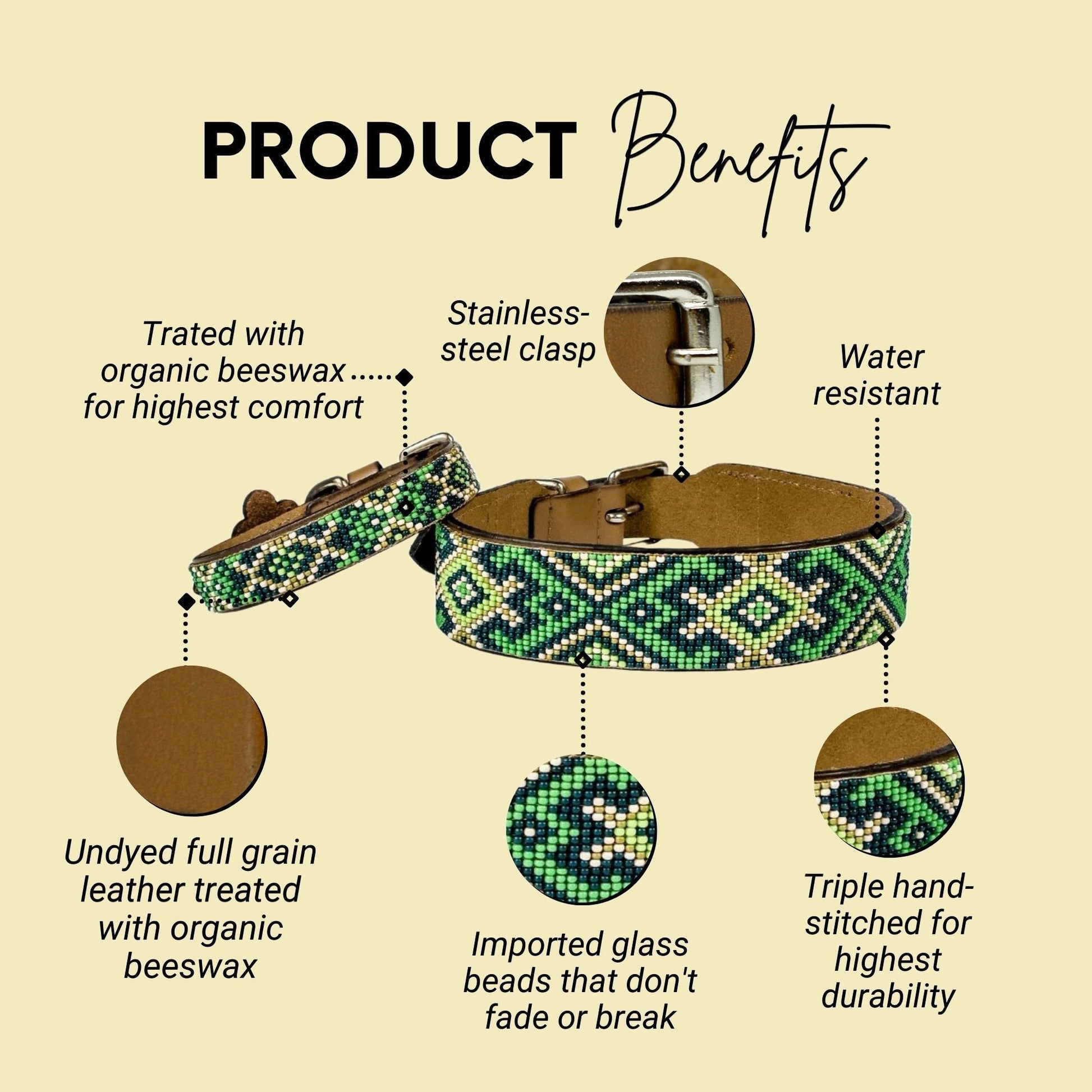 Our dog collars are luxury master pieces, completely unique and handmade by artisan women in Brazil. The vibrant colors, sun reflecting beads and unique design will make your little baby shine. Our pieces use full grain leather which is the highest rating for leather quality. Because full grain leather has the full, complete grain of the hide, it is the most durable leather and is solely used by luxury brands. This feature makes this collar very flexible and comfortable for your fur baby. Our leather is treated with organic beeswax which makes it suitable for outdoor activities such as hiking and the beach. Please note that our leather is purposely un-dyed and very pliable to provide your little pup with the highest comfort. Each bead is made of unbreakable glass and stitched one by one following the ancient Brazilian tradition of “tear beading” to make the stitching indestructible. This stitching method allows for resistance to scratching so you can be assured that the beads will not fall off. The strong buckles are water resistant, so mud and water playdates are allowed. This association of high-end materials combined with artisanal expertise in the manufacturing process make our collars very long lasting and unique. Please note that your purchase will contribute to the sustainable development and empowerment of artisan women from the community of Araxa in Minas Gerais, Brazil.