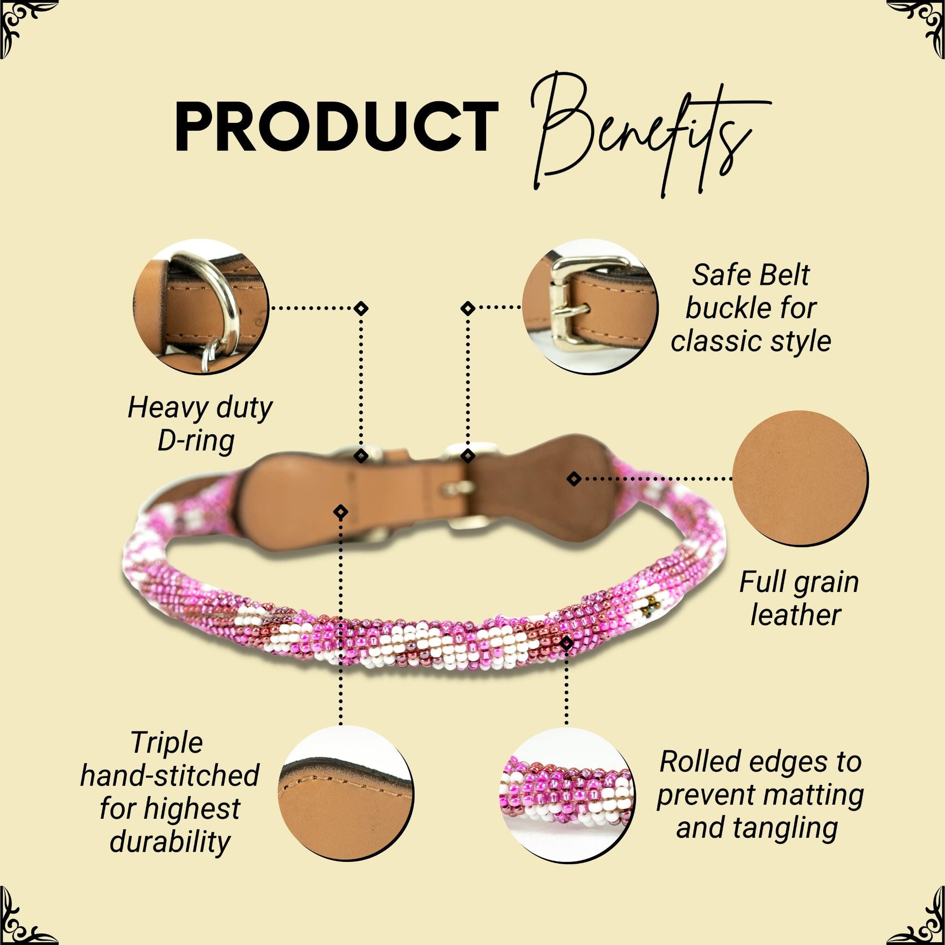 Super soft and strong Sambboho rolled leather beaded dog collar with heavy duty D-ring. The rolled design reduces matting and tangling of hair under the collar due to the rolled beaded edges. Rolled design recommended for long hair dogs. Comes with a safe belt buckle enclosure for a classic look. Collar includes the cute removable leather Sambboho tag. Triple hand-stitched for highest durability. Leather treated with organic beeswax for water resistance. Fully handmade in Brazil by women artisans with luxurious Slovakian glass beads. Ship from USA, fast free shipping, 30 day-returns, 1-year warranty.