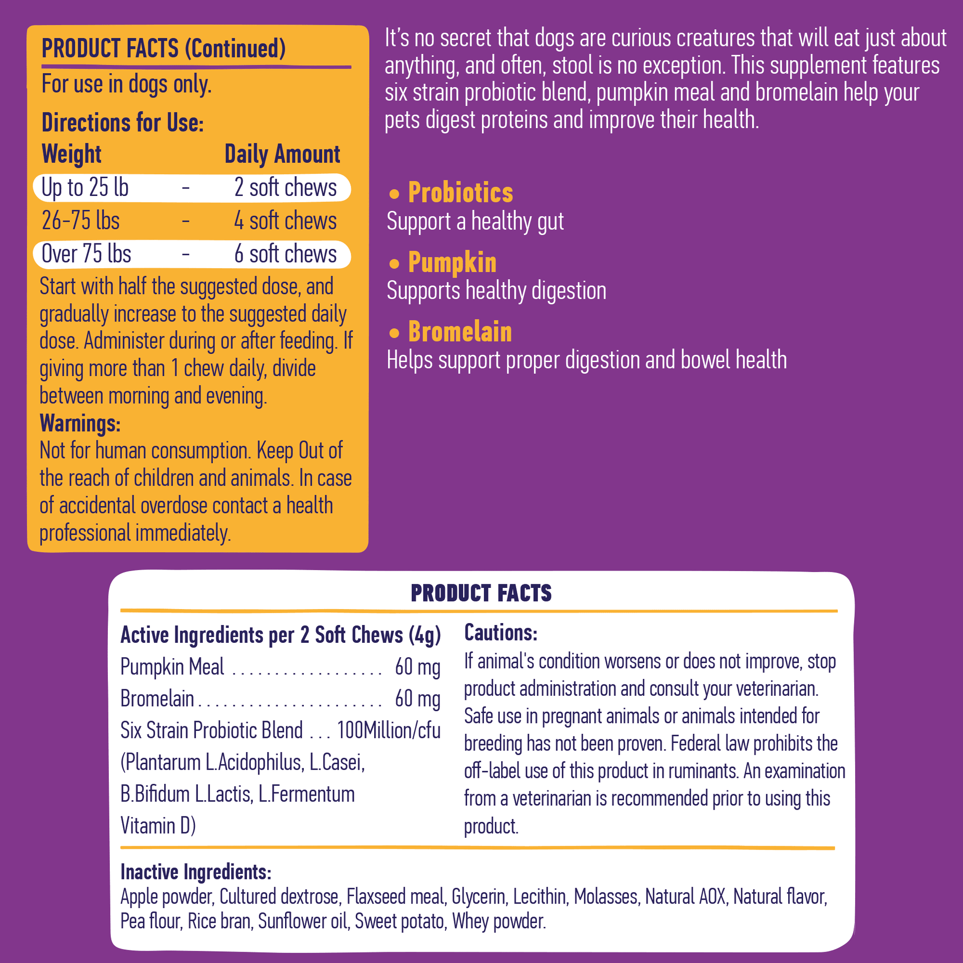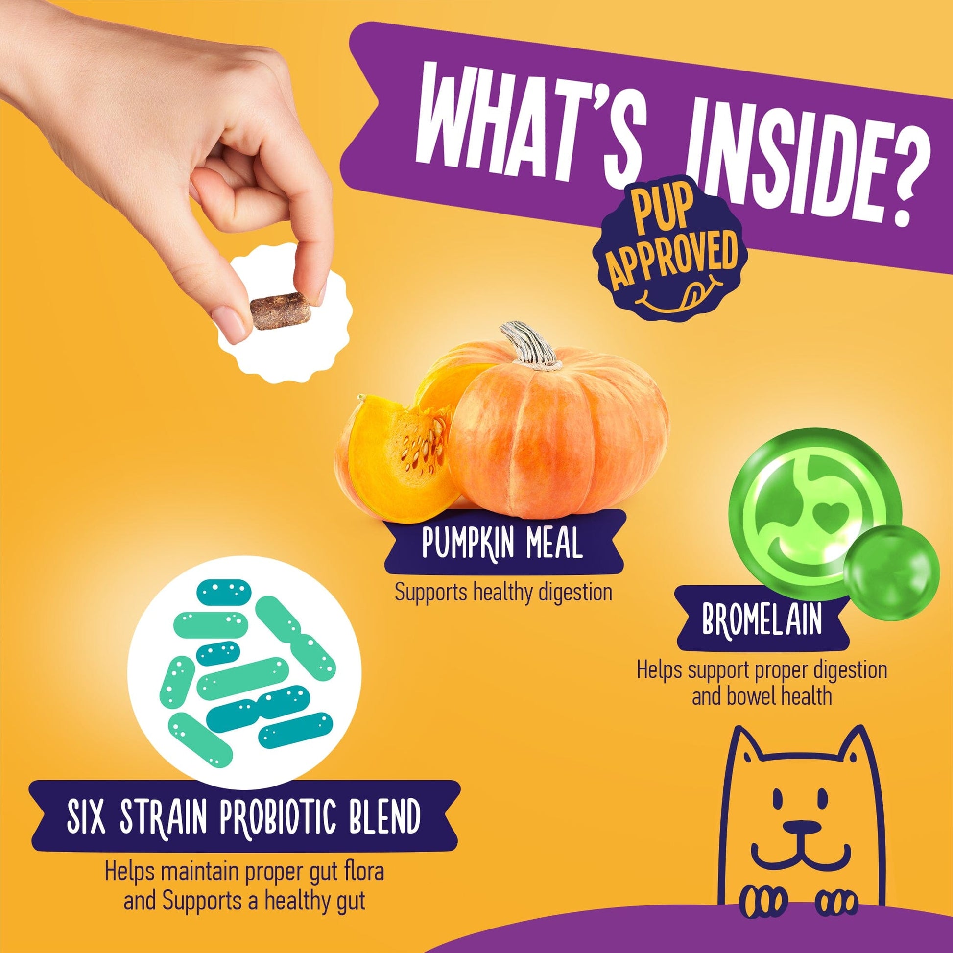 - Pure and safe formula contains six strain probiotic blend, pumpkin, bromelain;